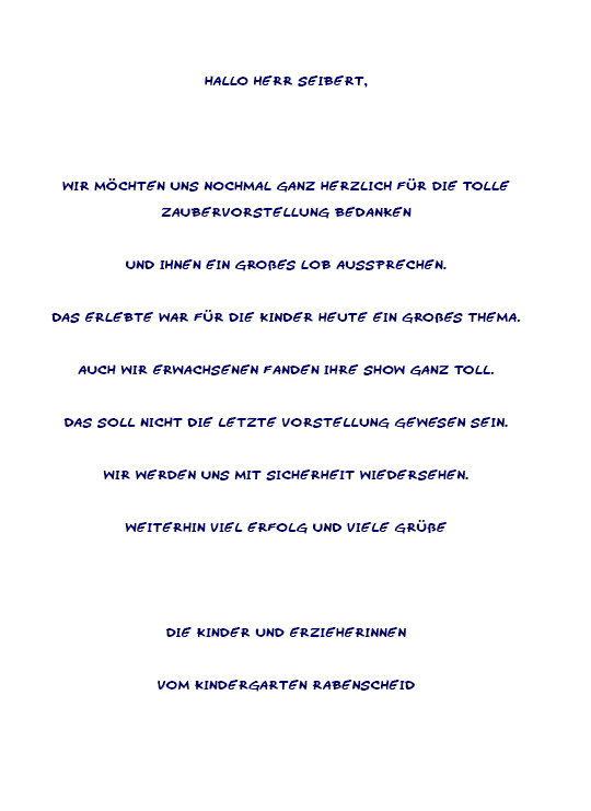 wir möchten uns ganz herzlich bei Ihnen für Ihren wunderbaren Auftritt auf unserem Sommerfest im Seniorenzentrum St. Josef Betzdorf bedanken. Ihre Zaubershow war ein echtes Highlight und hat sowohl unsere Bewohner als auch die Gäste begeistert. Es war schön zu sehen, wie viel Freude und Staunen Sie in die Gesichter der Menschen gezaubert haben.