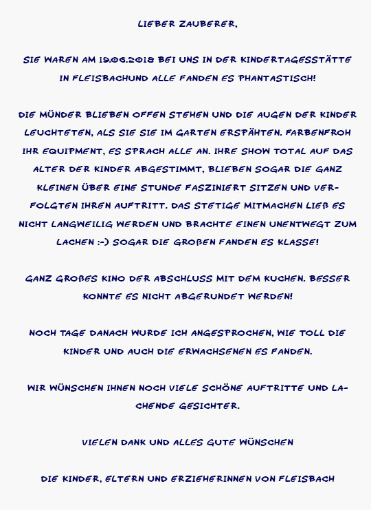Ein Feedback zur Zaubershow für Kinder in der ev. Freizeitstätte Dreifelden: